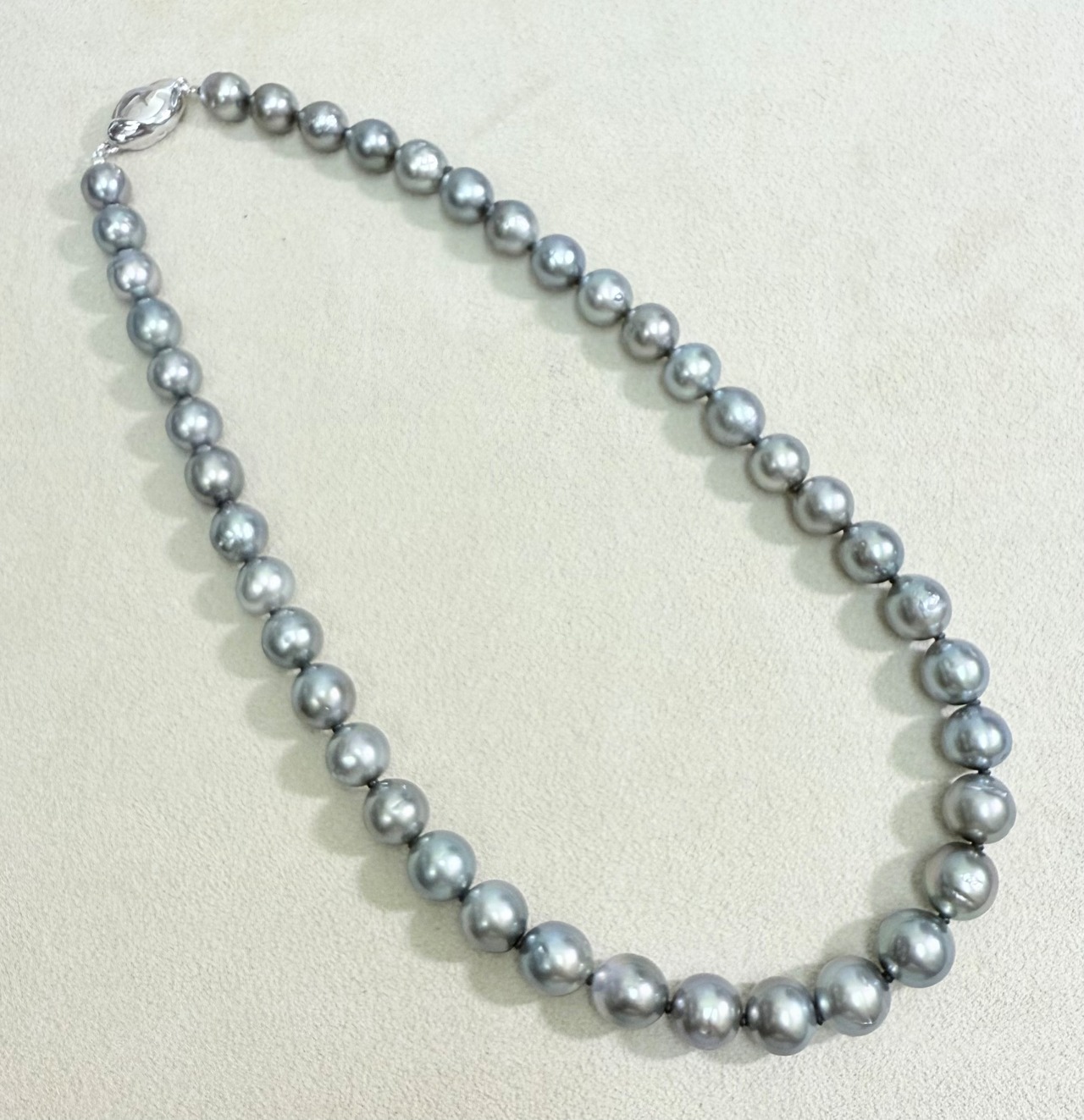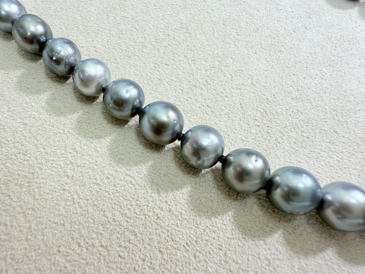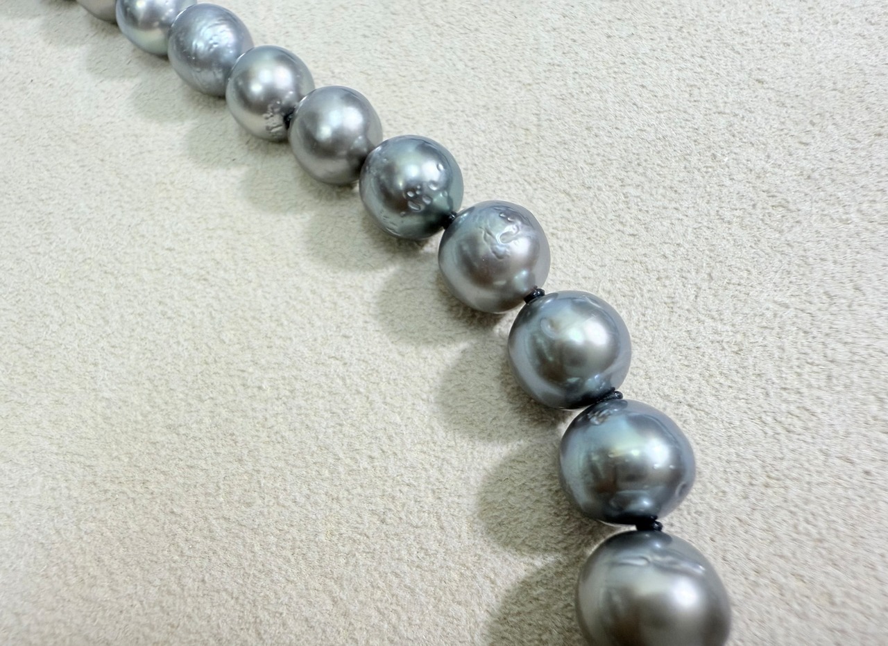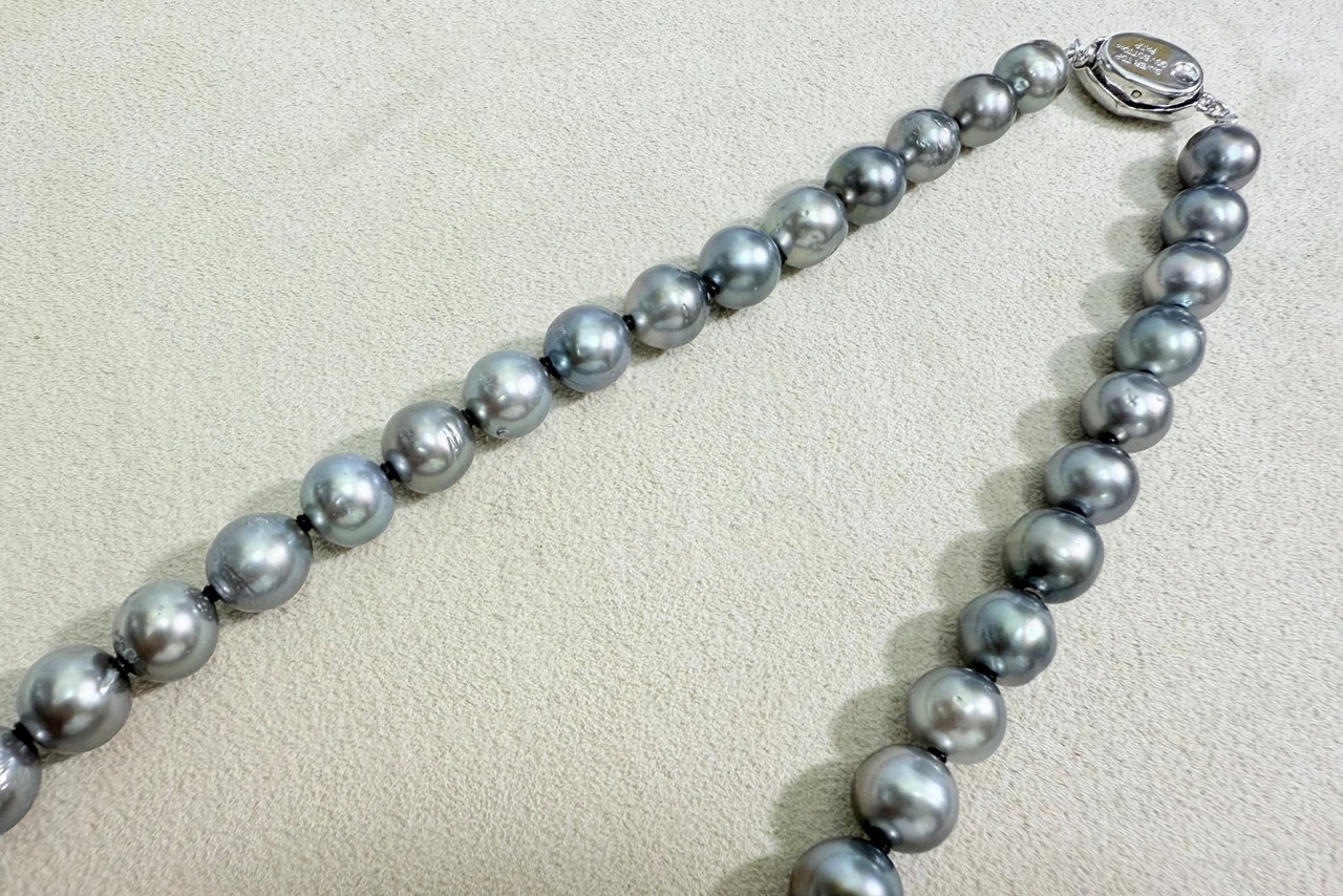 グレー系の色合いの黒蝶真珠ネックレスです。