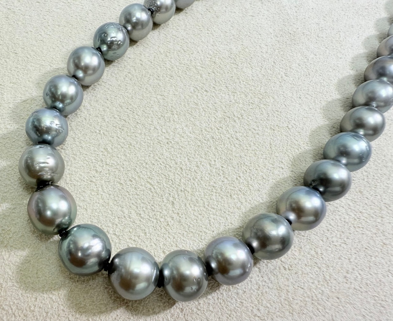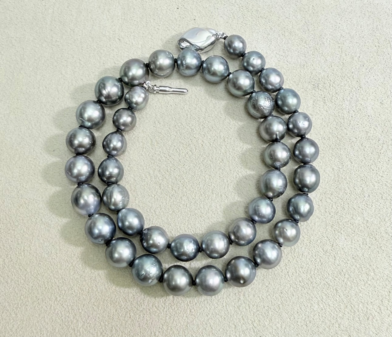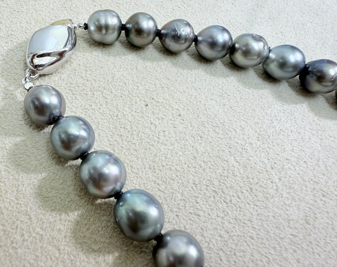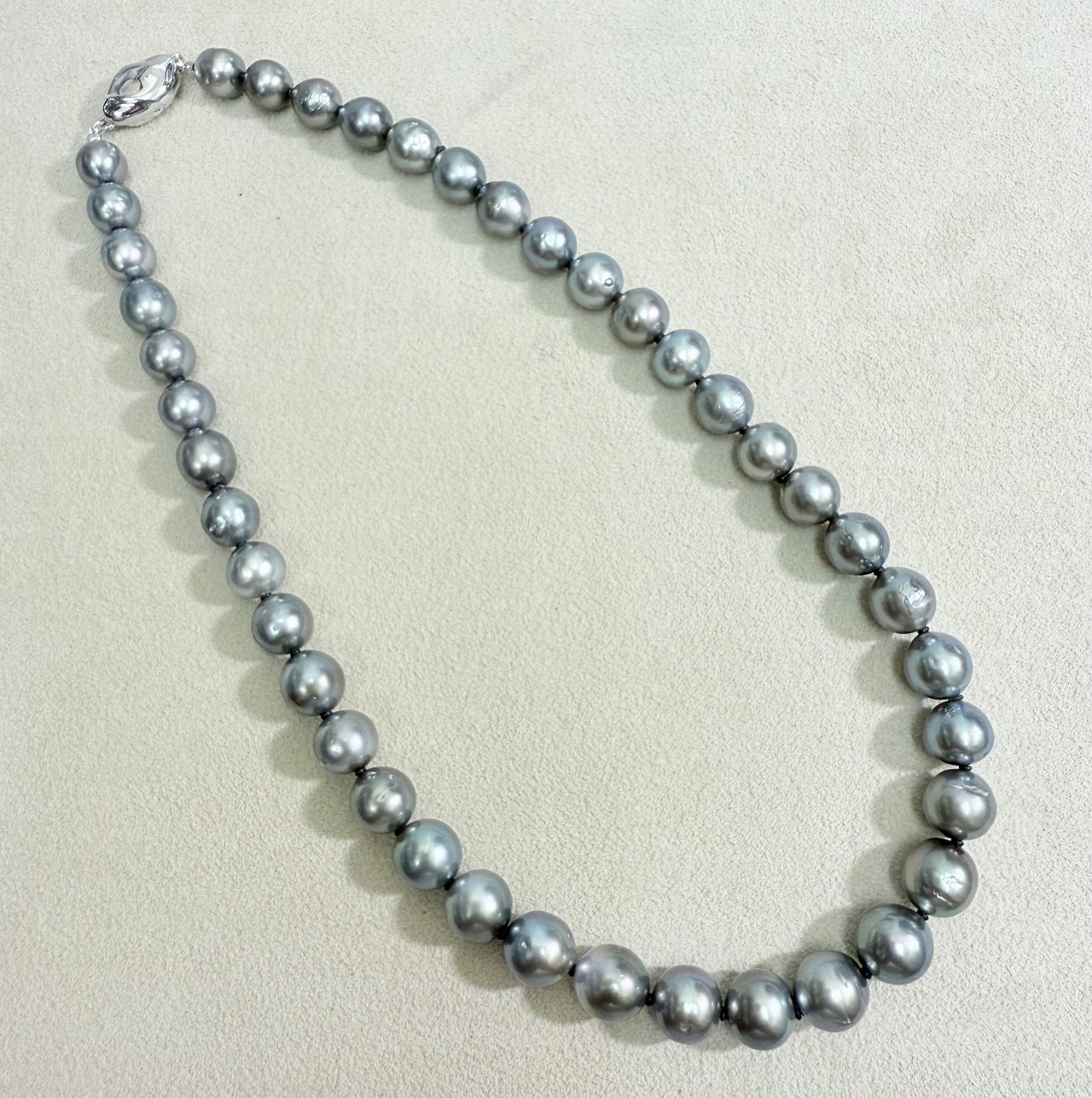 グレー系の色合いの黒蝶真珠ネックレスです。