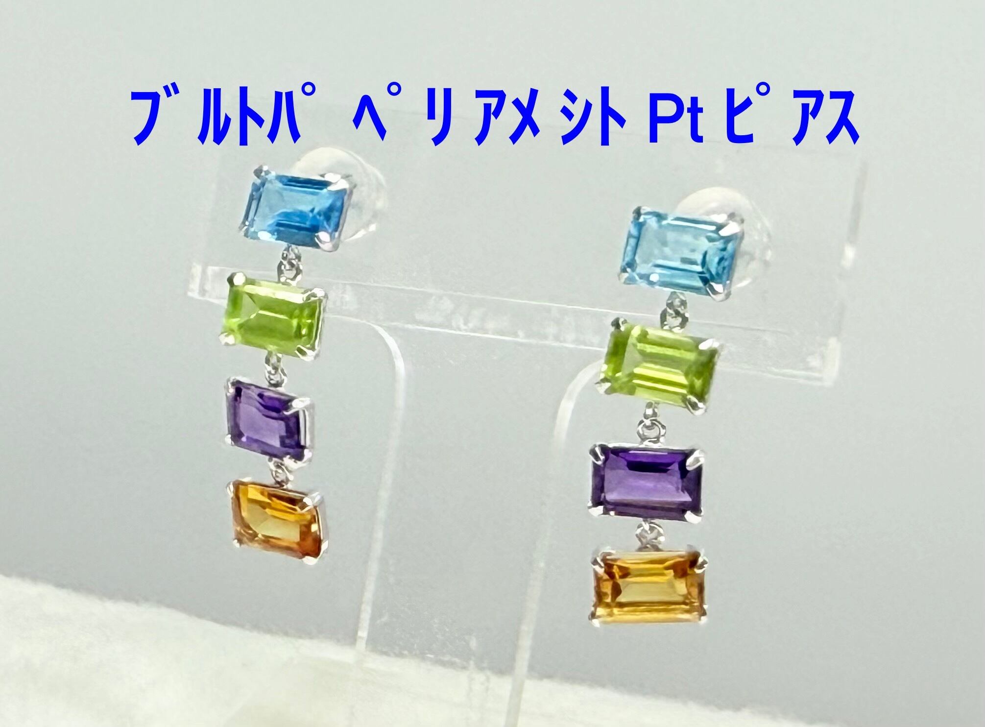 ブルートパーズ ペリドット アメジスト シトリン 半貴石 スクエア Pt Pt900 ピアス ロングピアス