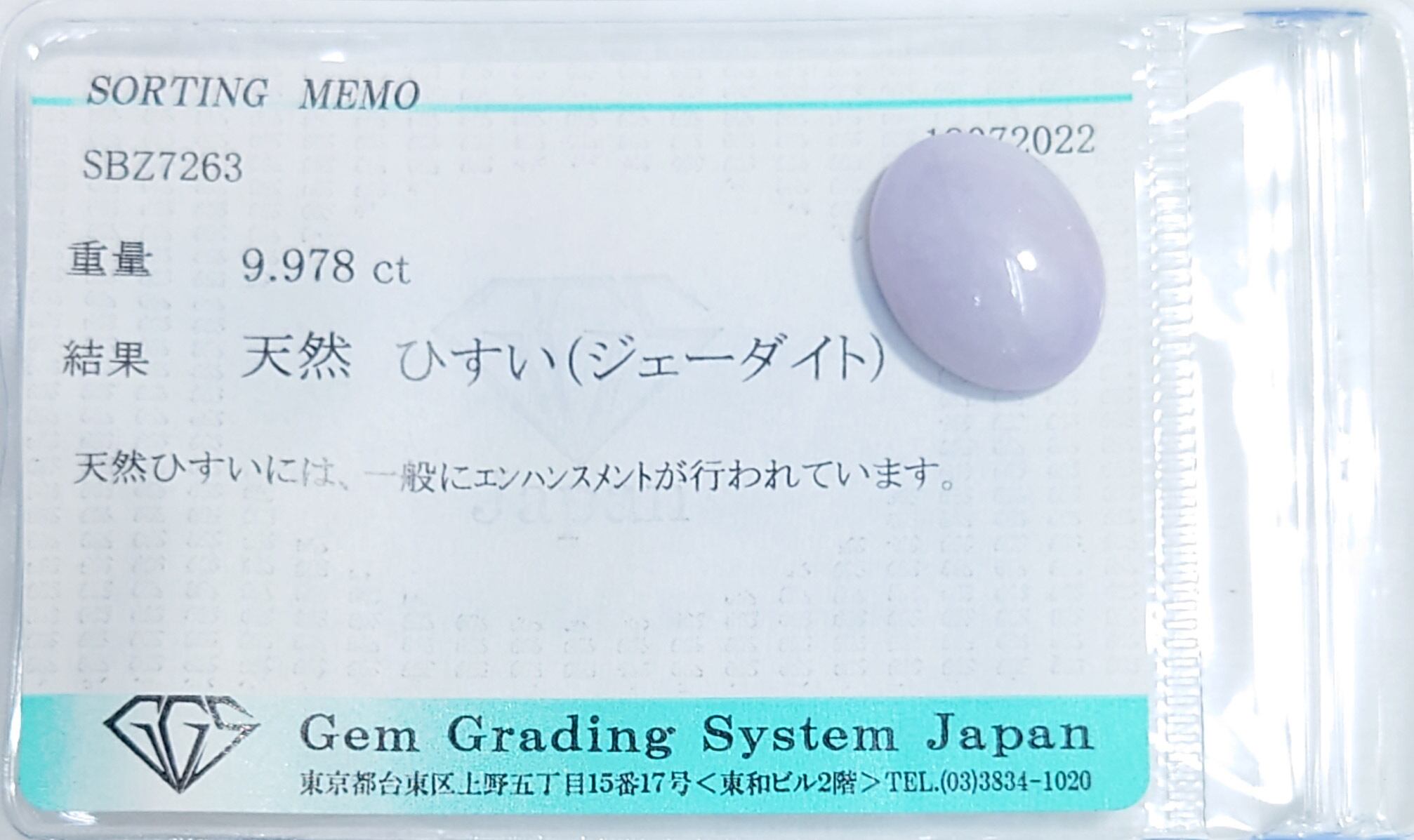 美品! ラベンダーヒスイ 9.978ct ソーティング付 ルース(LA-5797)