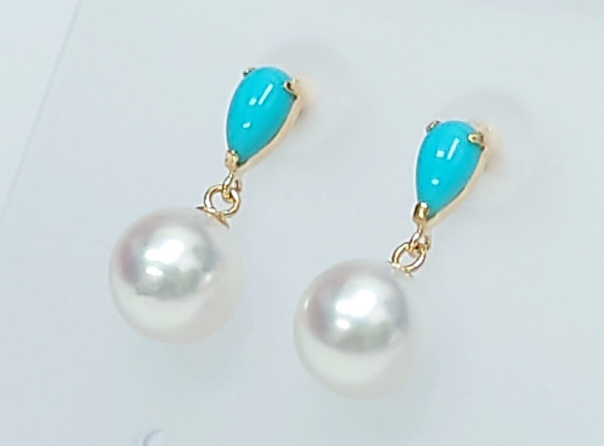 トルコ石 パール アコヤ真珠 K18 ピアス ロングピアス