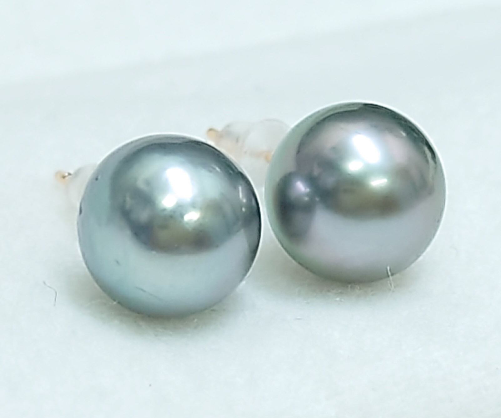テリの良いシルバー系の色合いの黒蝶真珠のピアスです。